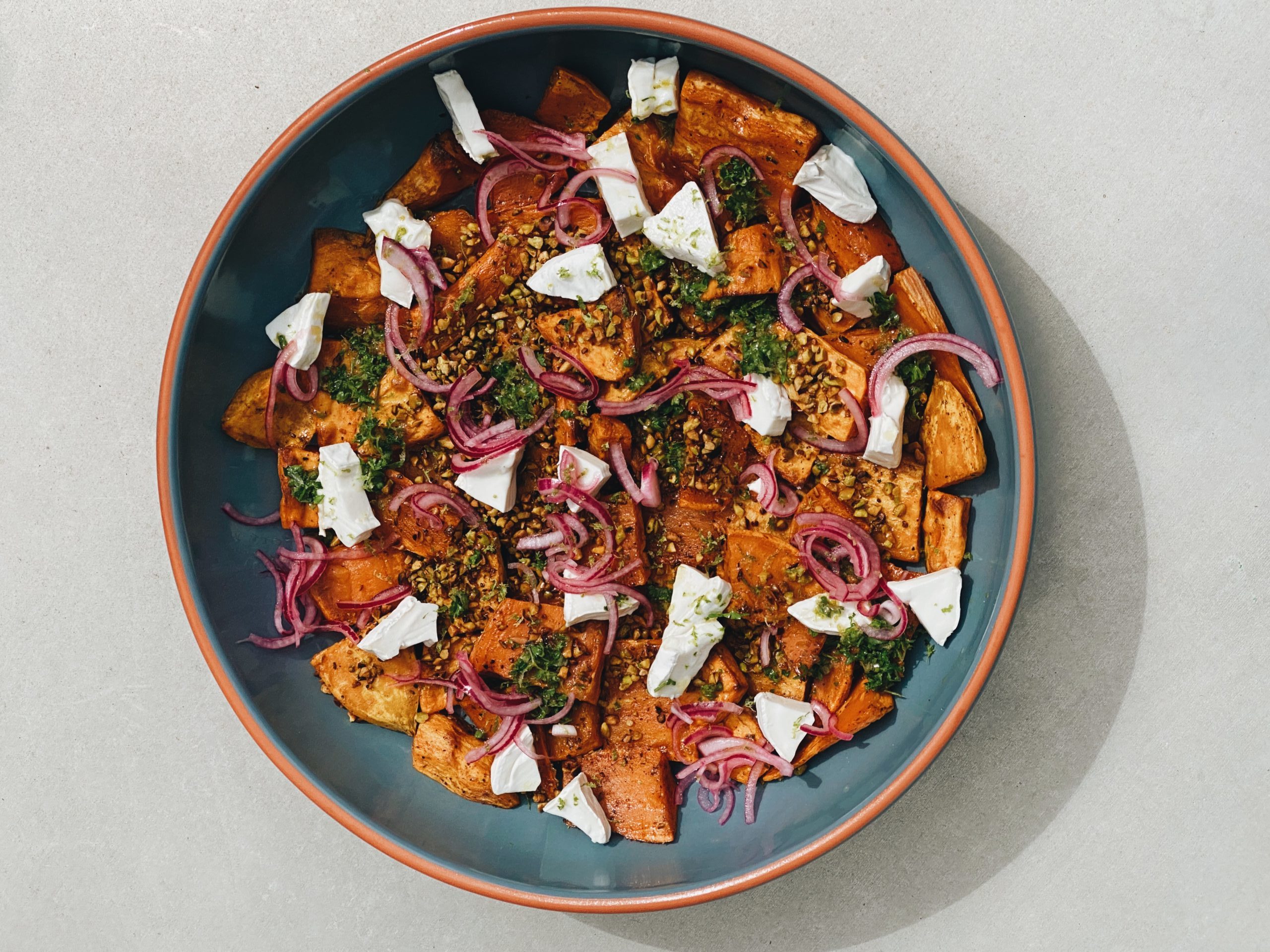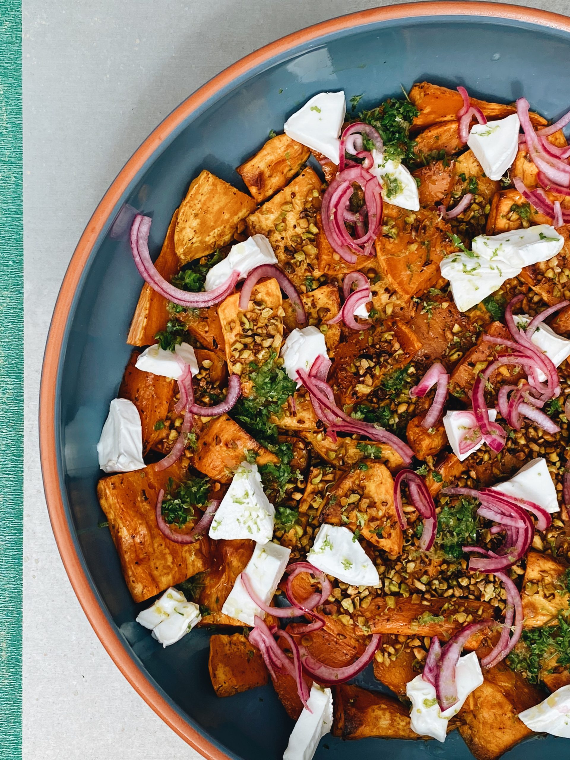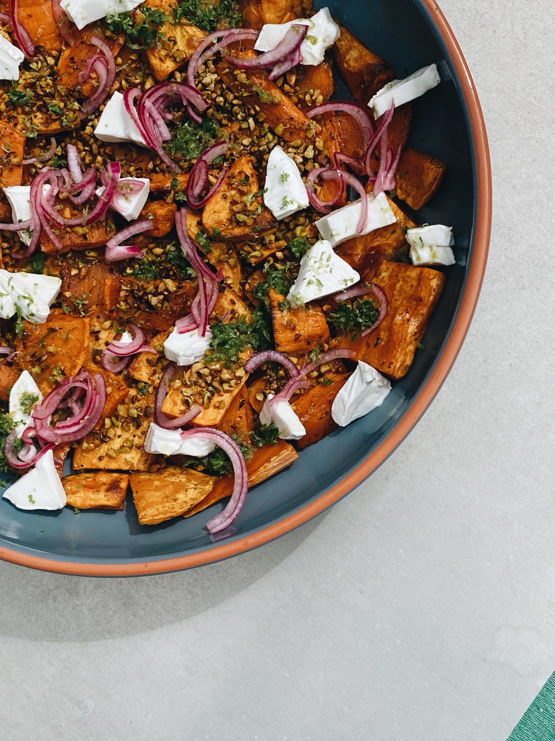Once the sweet potatoes are cold, arrange them on a platter and sprinkle the pieces of cheese, onions (drained) and finish with a drizzle of salsa verde and pistachios.